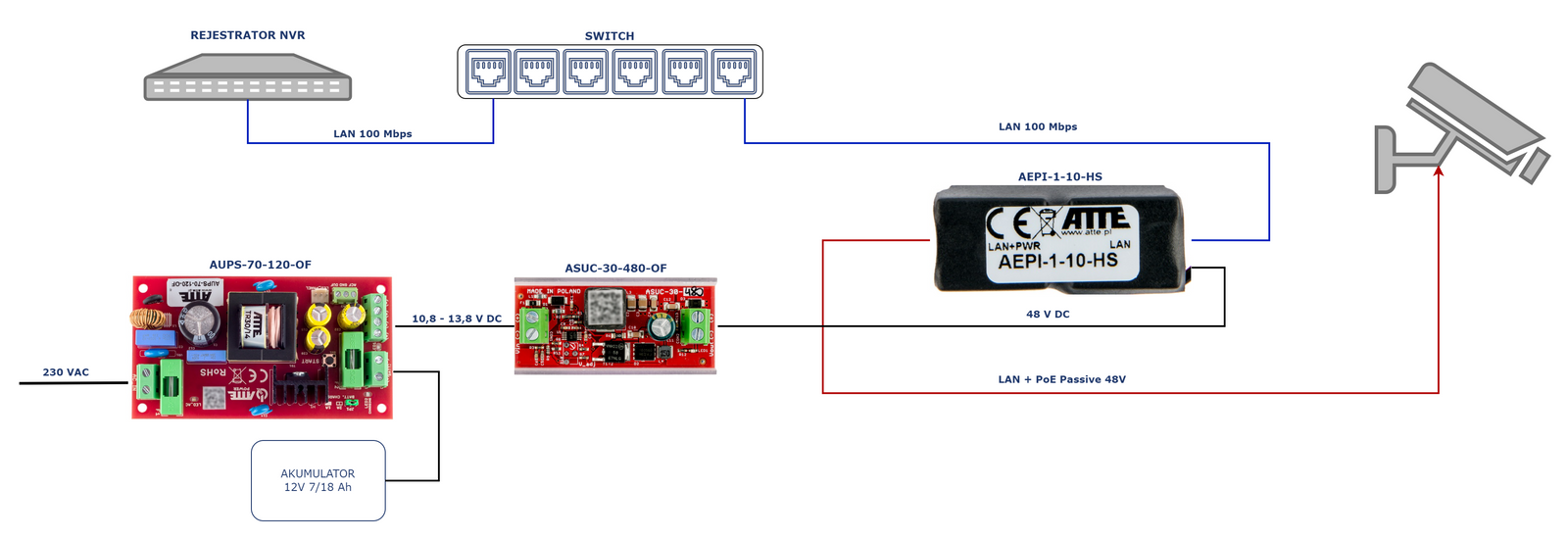Przykładowe zastosowanie ASUC-30-480-OF do zasilania jednej kamery IP PoE