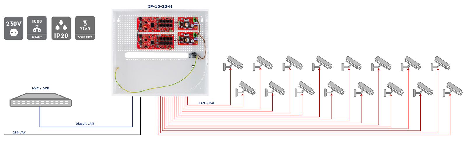 IP-16-20-H to gotowy zestaw, dedykowany do zasilania systemu telewizji przemysłowej IP składającego się z 16 kamer IP. Elektroniczne zabezpieczenia wyjść PoE zapewniają ciągłość pracy całego systemu przy zwarciu, lub przeciążeniu pojedynczych gałęzi zasilania, oraz automatyczny powrót napięcia po ustąpięniu awarii. Urządzenie znajduje zastosowanie w systemach wymagających zwiększonej przepustowości sieci takich jak monitoring CCTV 4K Ultra HD. Zestawy ze switchem PoE przeznaczone są do współpracy z kamerami IP oraz innymi urządzeniami sieciowymi zasilanymi w standardzie PoE 802.3at/af oraz PoE PASSIVE.