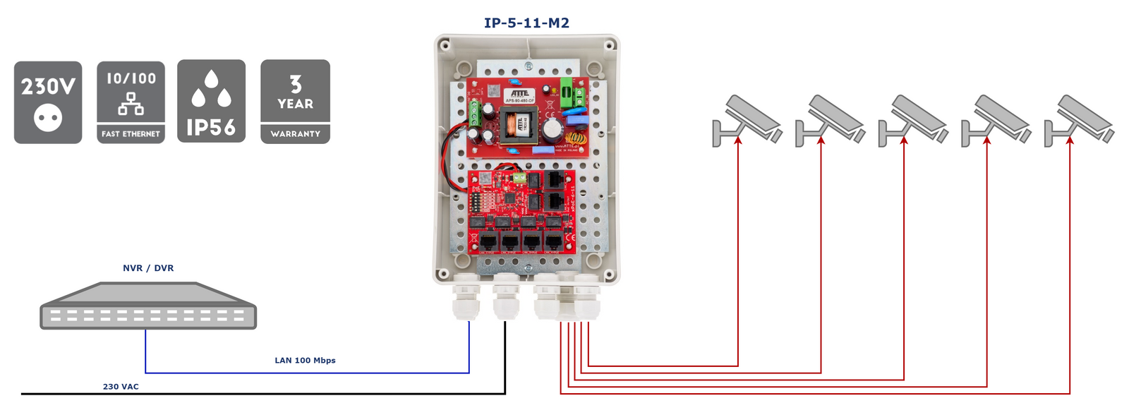 IP-5-11-M2 to gotowy zestaw, dedykowany do zasilania systemu telewizji przemysłowej IP składającego się z 5 kamer IP. Elektroniczne zabezpieczenia wyjść PoE zapewniają ciągłość pracy całego systemu przy zwarciu, lub przeciążeniu pojedynczych gałęzi zasilania, oraz automatyczny powrót napięcia po ustąpięniu awarii. Zestawy ze switchem PoE przeznaczone są do współpracy z kamerami IP oraz innymi urządzeniami sieciowymi zasilanymi w standardzie PoE 802.3at/af oraz PoE PASSIVE.