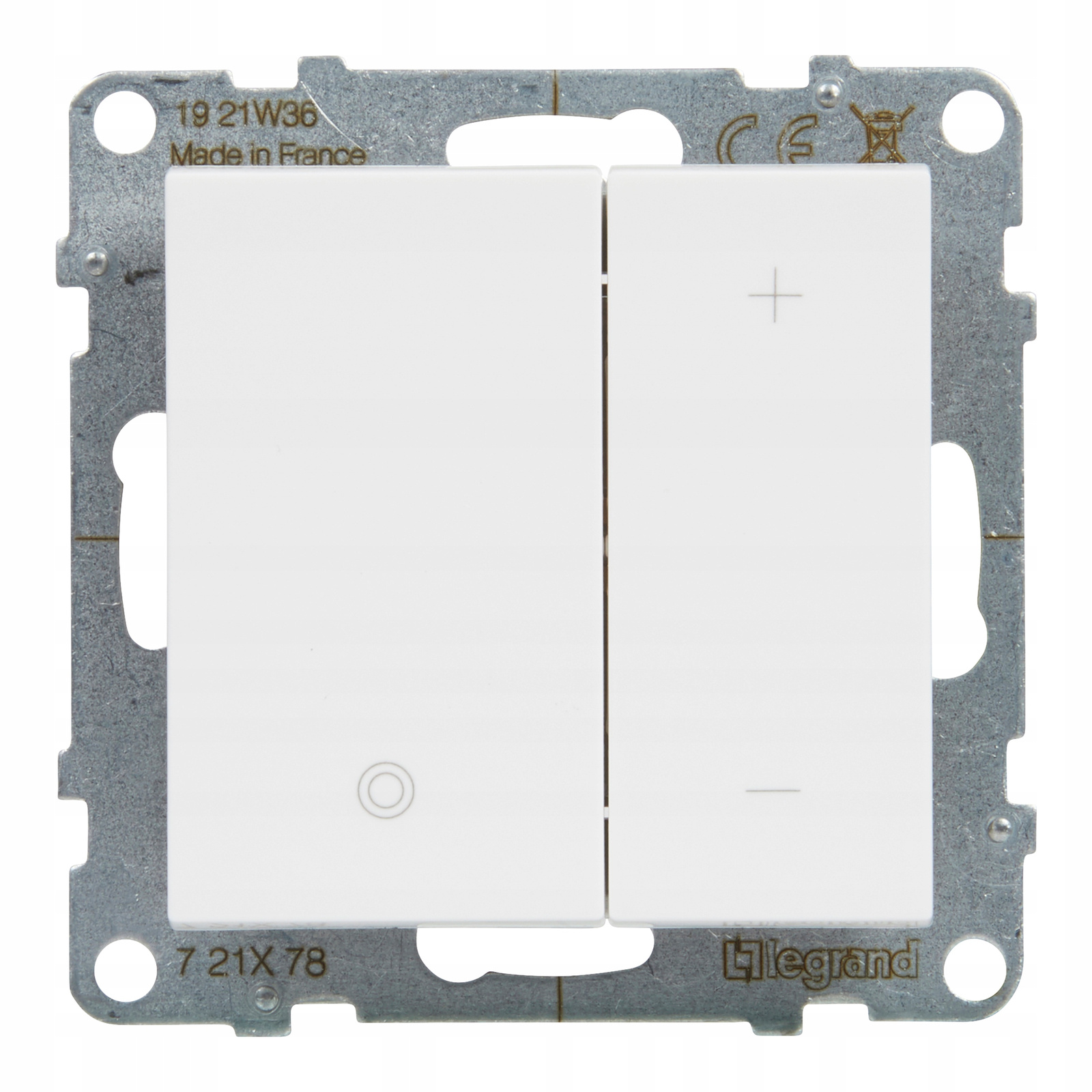 Ściemniacz przyciskowy do LED w kolorze białym z serii Suno, marki Legrand.