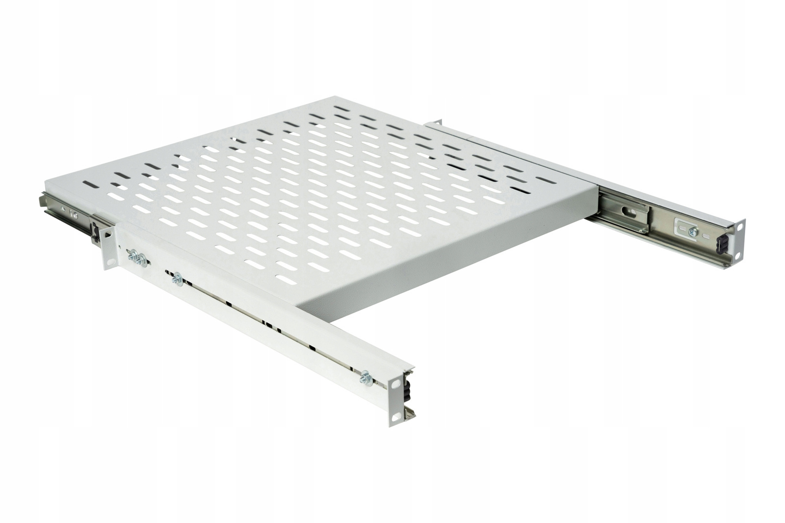 Metalowe prowadnice zapewniają lekkość i wygodę użytkowania. Zapewniając pełen wysuw półki, pozwalają na łatwy dostęp do urządzeń, które wymagają regularnej konfiguracji. Perforowany spód półki zapewnia odprowadzenie ciepła, co jest niezbędne do prawidłowego funkcjonowania urządzeń. Ponadto mogą posłużyć do mocowania za pomocą opasek kablowych. Metalowy uchwyt ułatwia wysunięcie półki.