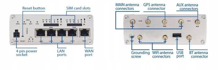 • Anteny: 4 x SMA dla LTE, 2 x RP-SMA dla Wi-Fi, 1 x RP-SMA dla Bluetooth, 1 x SMA dla GNNS