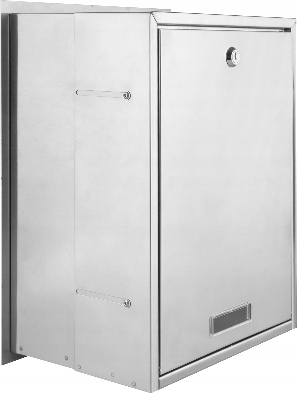 Panel przedni o szerokości 285 mm i wysokości 385 mm posiada otwór wrzutowy zabezpieczony klapką. Otwór (o wymiarach 241 x 45 mm) posiada zagięcie utrudniające wyjęcie korespondencji przez osoby niepowołane. Panel tylni wykonany jest w formie pełnych drzwiczek zamykanych na klucz. W drzwiczkach umieszczone zostało okienko, które umożliwia sprawdzenie zawartości bez konieczności otwierania skrzynki.