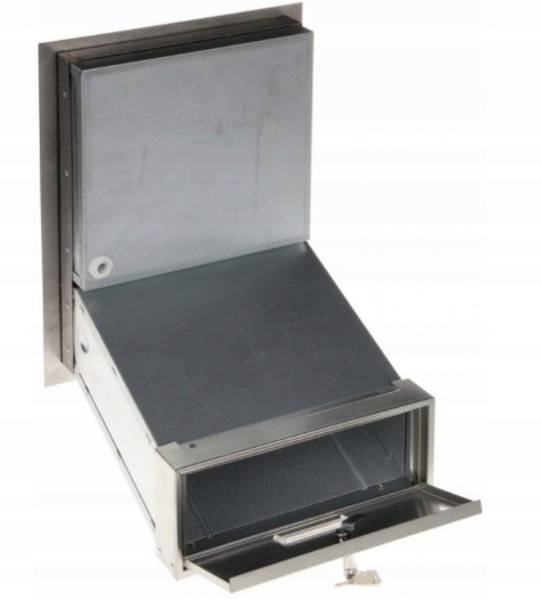 Przedni i tylni panel skrzynki pocztowej wykonany jest ze szlifowanej stali nierdzewnej grubości 2 mm. Klapka osłaniająca otwór wrzutowy również wykonana jest ze stali szlachetnej. Panel przedni o szerokości 285 mm i wysokości 385 mm posiada otwór wrzutowy zabezpieczony klapką. Otwór posiada zagięcie utrudniające wyjęcie korespondencji przez osoby niepowołane. Panel tylni o szerokości 260 mm i wysokości 110 mm posiada zamykane na klucz drzwiczki z okienkiem, które umożliwiaj sprawdzenie zawartości bez konieczności otwierania skrzynki.
