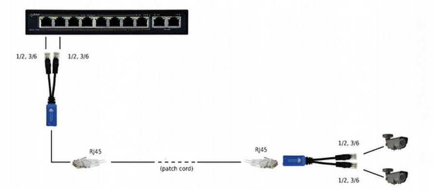 Splitter P-POE2 umożliwia przesyłanie zasilania i danych do dwóch kamer IP PoE lub innych urządzeń zgodnych z tym standardem za pomocą skrętki UTP kat. 5e. Wykorzystuje 4 pary przewodów, gdzie dwie pary obsługują jedno urządzenie, natomiast pozostałe drugie. Wymaga to stosowanie wyłącznie akcesoriów, które są zgodne ze standardem 802.3af/at mode A, przesyłają dane i zasilanie parami 1/2 i 3/6. Urządzenie przeznaczone jest do pracy w sieciach 10/ 1000Mbs.