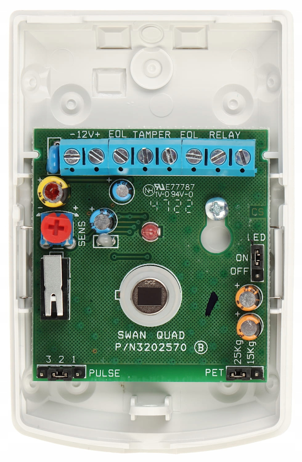 SWAN QUAD - Czujka ruchu PIR, przystosowana do montażu wewnętrznego. Charakteryzuje się smukłym, eleganckim wyglądem i dobrymi parametrami detekcji. Wysoką skuteczność zawdzięcza zastosowaniu poczwórnego elementu PIR i dedykowanemu układowi elektroniki. Czujka doskonale sprawdza się w systemach alarmowych domów prywatnych, w których przebywają niewielkie zwierzęta. Czujka została zbudowana w oparciu o układ elektroniki ASIC. Zapewnia on wiarygodną detekcję i znacznie uodparnia czujkę na wystąpienie fałszywych alarmów, spowodowanych poruszaniem się niewielkich zwierząt.
