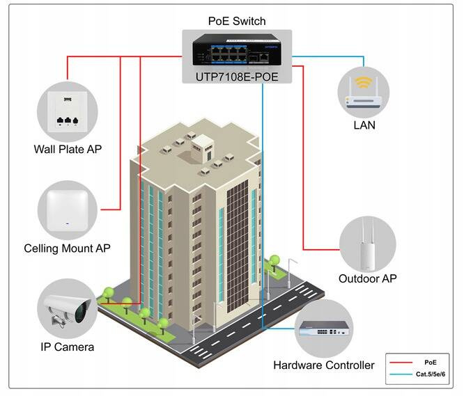 Niezawodny switch UTEPO jest urządzeniem LAN, które umiejętnie uzupełni każdą infrastrukturę sieciową dostępną w domu, sklepie, czy biurze. Wykorzystując szeroką funkcjonalność switcha w profesjonalnych instalacjach monitoringu IP możliwe jest kompleksowe zasilenie kamer IP w miejscach wolnych od źródeł zasilania i w efekcie zrealizowanie skutecznych systemów zabezpieczeń.