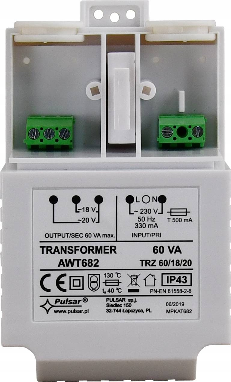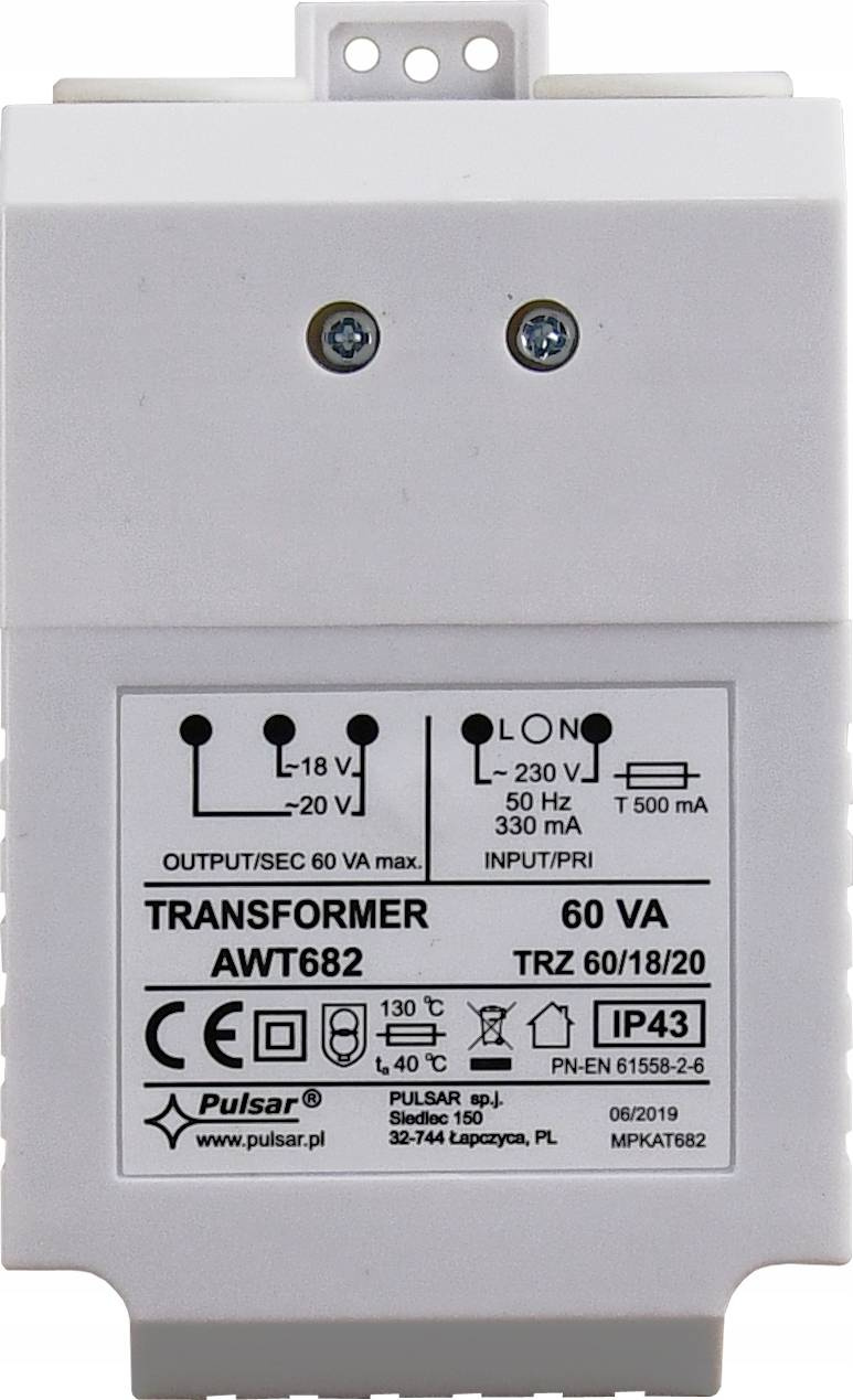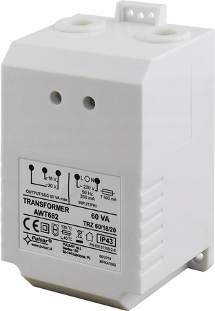 Transformator zamienia napięcie sieciowe 230V AC, na napięcie 18V AC lub 20V AC. Przystosowany do zasilania urządzeń systemów alarmowych, których moc skuteczna nie przekracza 60 VA. Transformator posiada zabezpieczenie przeciwzwarciowe i przeciążeniowe, realizowane przy pomocy bezpieczników topikowych.