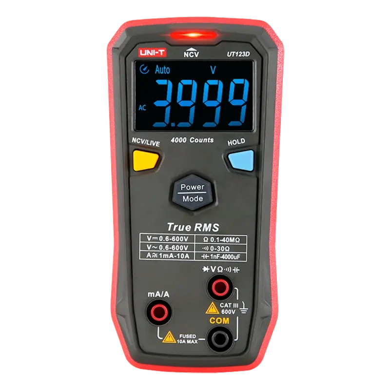 Multimetr UNI-T UT123D to inteligentny multimetr cyfrowy, który może automatycznie zidentyfikować funkcję , zakres i poprawić łatwość obsługi. Ekran EBTN pozwala użytkownikowi uzyskać wyraźny wyświetlacz nawet podczas pracy w ciemnym otoczeniu i czytelne odczyty pod maksymalnym kątem. Jego unikalny wygląd i kompaktowa konstrukcja sprawiają, że jest to świetne narzędzie dla użytkowników domowych i majsterkowiczów.