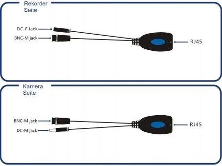 Złącza BNC są wyprowadzone na przewodzie, a skrętkę komputerową możemy podłączyć za pomocą wtyku RJ-45.