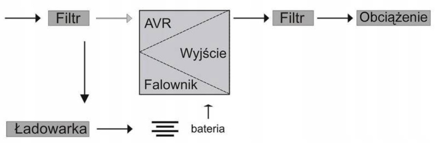 Kiedy UPS jest w normalnym trybie pracy, prąd przechodzi przez filtr i "szkodliwe" fale są filtrowane. Następnie UPS ładuje baterię, zasila falownik i dostarcza przefiltrowany prąd na wyjście urządzenia.