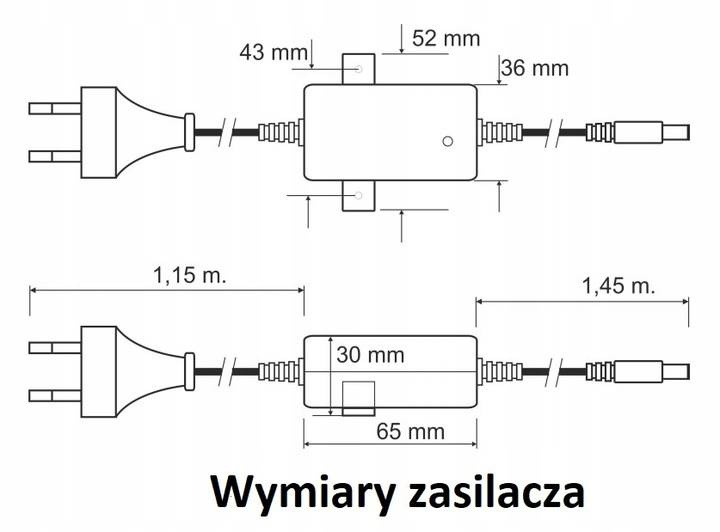 Przewód zasilający zakończony jest wtyczką DC 5,5/2,1.