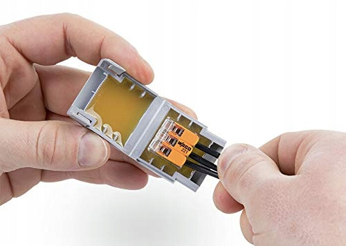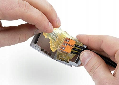 Osłona GELBOX 46mm z żelem do złączek 207-1332 WAGO. To praktyczna blokada z żelem 207-1332 do złączek szynowych. Do czego służy tego typu osłona? Jej zadaniem jest ochrona złączek i przewodów w niej poprowadzonych – przed zabrudzeniem i zachlapaniem. Hermetyczna osłona GELBOX jest bowiem wewnątrz wypełniona żelem. Po otwarciu osłony – należy położyć na jednej z części złączkę Wago i zamknąć osłonę. Żel znajdujący się w osłonie rozprowadzi się wokół szczelin w złączce, dzięki czemu zabezpieczy dodatkowo połączone przewody. To doskonałe rozwiązanie, które sprawdzi się zwłaszcza w miejscach o podwyższonej wilgotności i zapyleniu. Można ją stosować wewnątrz pomieszczeń, jak i na zewnątrz, np. w garażach, zewnętrznych gniazdach instalacyjnych, przy oświetleniu parkingów, w myjniach, ogrodach, czy w rolnictwie.