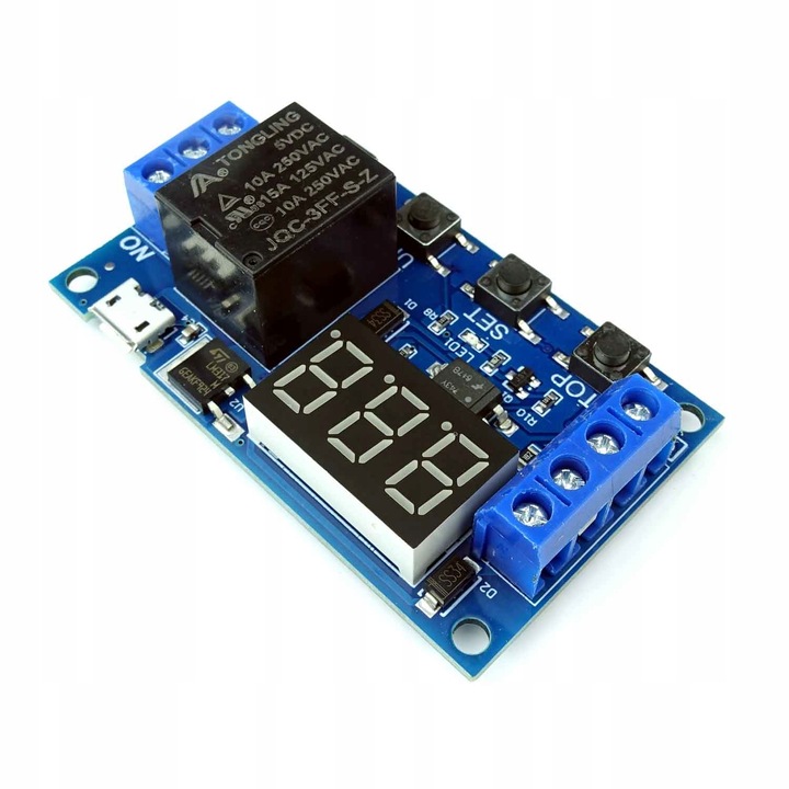Moduł przekaźnika wraz z funkcją timera działającego w 9 trybach i bardzo szeroki wachlarz ustawienia odliczania czasowego w zakresie od 0,1 sekundy do 999 minut czyni ten moduł bardzo uniwersalnym w zastosowaniu. Dodatkowym atutem jest pamięć ustawień w przypadku braku zasilania.