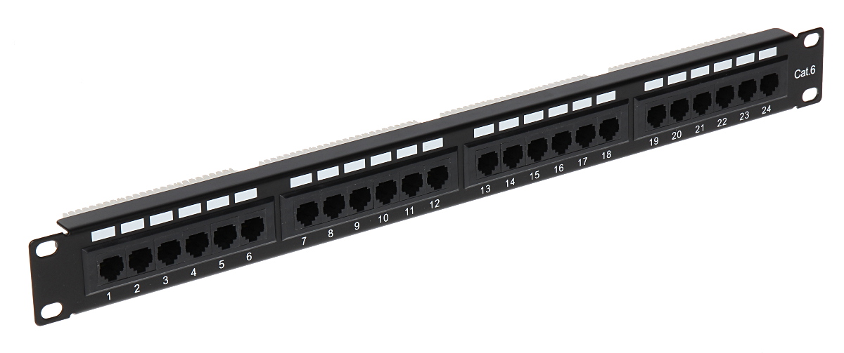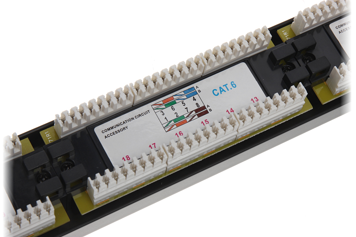 Patch panel stanowi zakończenie okablowania strukturalnego dla kabli UTP kat 6. Urządzenie montowane jest do szafy RACK 19".