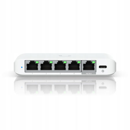 Port wejściowy PoE-in 2,5G Gigabit Ethernet umożliwia łatwe zasilanie przez Power over Ethernet, eliminując potrzebę stosowania dodatkowych zasilaczy lub gniazdek. Maksymalny pobór mocy USW Flex Mini 2.5G to 5 W (AC/DC) i 6,4 W (PoE). UniFi Switch Flex Mini 2.5G oferuje zdolność przekierowania do jednoczesnego przetwarzania ruchu na wszystkich portach z szybkością linii bez utraty pakietów. Aby zwiększyć wszechstronność, przełącznik może być również zasilany za pomocą dołączonego adaptera USB-C 5 V, 1 A, co ułatwia integrację z różnymi środowiskami. Ta elastyczność w zakresie opcji zasilania zapewnia, że Flex Mini można umieścić w różnych lokalizacjach, co czyni go wszechstronnym dodatkiem do sieci.